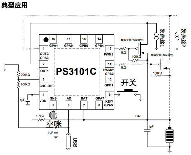 PS3101C是一款高集成度,应用于各种电子烟的专用集成芯片。内置短路保护,PWM产生等 功能,支持按键启动,待机低功耗,内置MCU可对IO进行灵活操作,实现灵活的外设应用。
