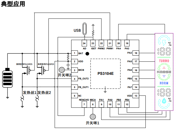 PS3104E是电池以及功率路径管理的集成式SoC,具有双MIC检测,双PWM输出的特点,支持 双发应用。 PS3104E集成电子烟功率通路控制功能,包括恒压/恒功率PWM输出,阻抗检测,油量检测, 输出短路,低阻保护,发热丝插拔检测,PWM打开超时保护等功能。 PS3104E集成电池管理相关功能,包括最高至1A的线性充电器,并具有过压保护功能,最高耐 压至28V。集成高精度库仑计,实时检测电池电量。还具有电池过压等保护功能。 PS3104E内置MCU可对11个IO进行灵活操作,可实现如。